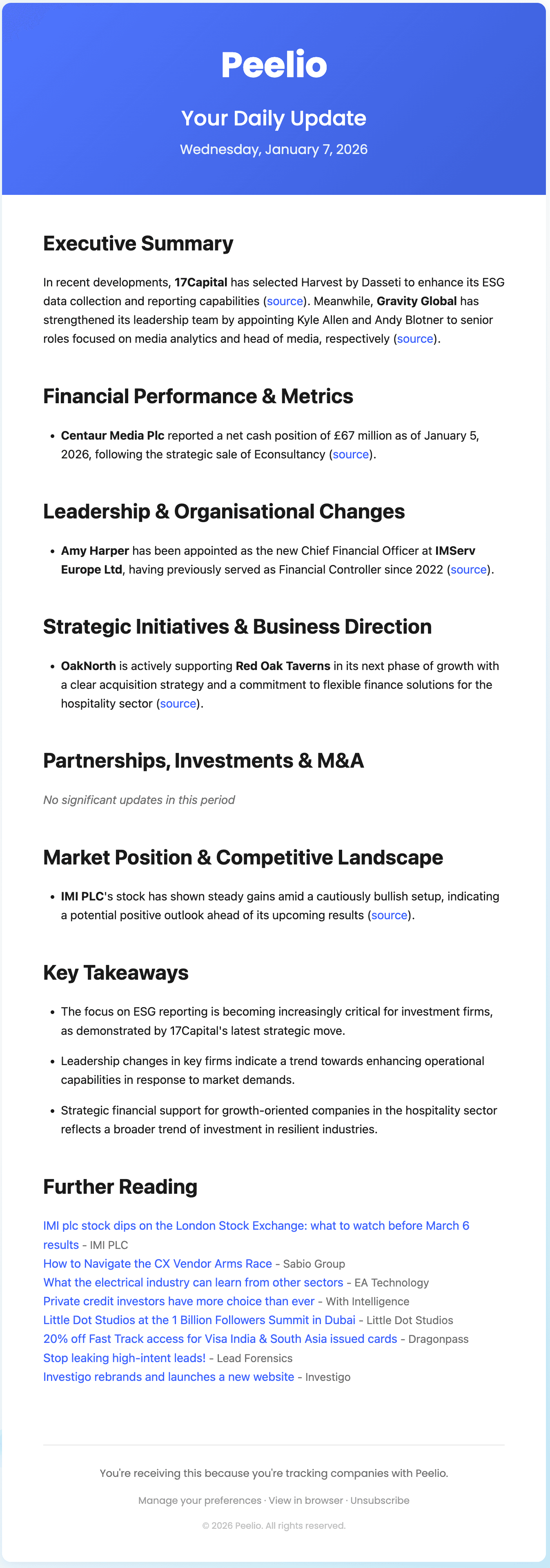 Peelio delivers laser-focused company updates, powered by AI and personalised to what you sell - so you can reach out when it matters most.
